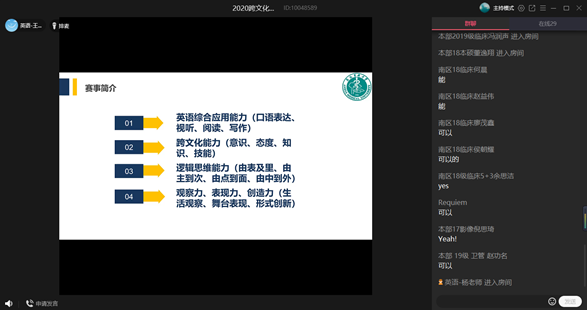 本次培训由外语系教师王然和鲁沛共同主讲, 在QQ群课堂分两个阶段进行。第一阶段,鲁沛老师介绍了高低语境、一元与多元时间等跨文化交际常用理论框架,为学生打下理论基础;第二阶段,王然老师从赛事规则与评价标准,医学情景跨文化分析和跨文化案例分析方法三个方面做了详细讲解,并结合新冠肺炎疫情中的文化现象进行了生动解读。