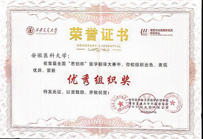近日,中华医学会全国医学外语学组公布了全国首届“思创杯”医学翻译大赛结果,性爱电影 第二临床医性爱电影 2018级学生王沁仪在1237名参赛者中表现突出, 获得优秀奖,性爱电影 获得优秀组织奖。