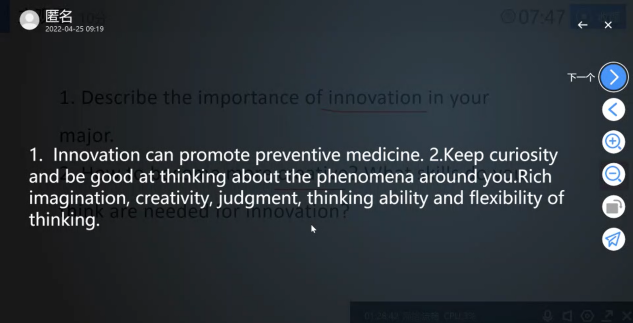 最后,话题讨论回归学生主体,以提问的方式引导学生思考:作为大学生,应该如何提高创新能力?在线上互动过程中,鲁老师将学生回答内容与课文内容相结合,并对学生表达进行即时反馈。