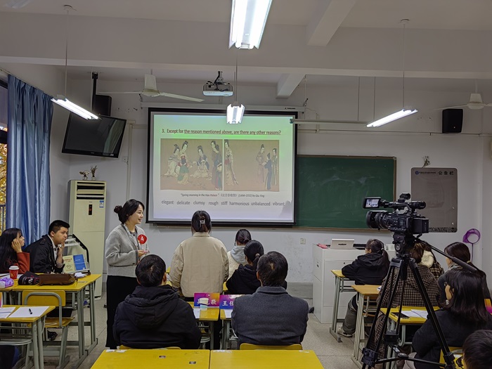 本次教学大赛分为单元教学设计和现场教学展示两部分。在教学展示中,主讲教师冷冰现场陈述对授课素材的整体教学设计,展示单元教学过程中教学目标的设定和具体实施之间的逻辑关系,并基于整体教学设计中的具体版块进行了20分钟的授课演示。性爱电影 外语教学团队选择“中国服饰文化”的单元主题,选取单元课文分析和讲述中国故事部分进行教学展示,以学生为中心、项目产出为导向,设计出包括看图说话、视频讨论、讲述中国文化故事等形式多样的教学环节。整个教学过程引导学生全面、深入地理解中国传统服饰文化,及其在当代中国的创新,引导学生坚定文化自信,运用英语更加系统、精准地讲好中国故事,提升学生的跨文化国际传播能力。