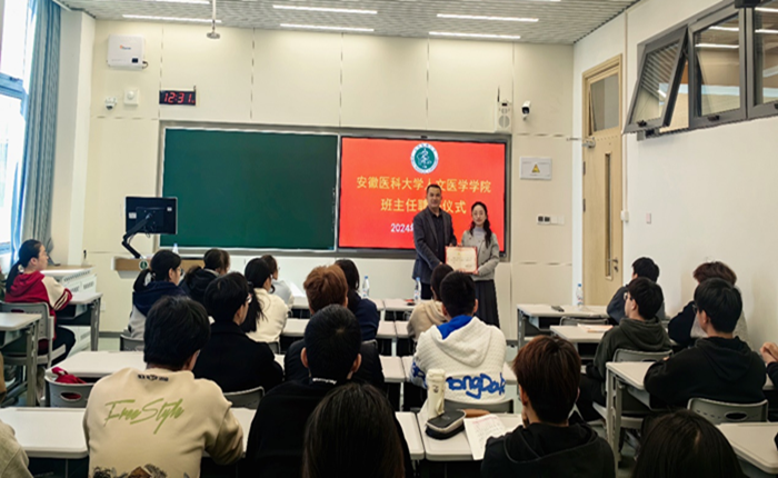 在班主任聘任仪式上,运动康复系主任陈凯华为2024级新生班主任张梦琦颁发聘书,并强调班主任是学生成长道路上的引路人,肩负着培养学生综合素质的重要使命,要在党的二十大和二十届三中全会精神的指引下,培育具备家国情怀、全球视野的医学人才。