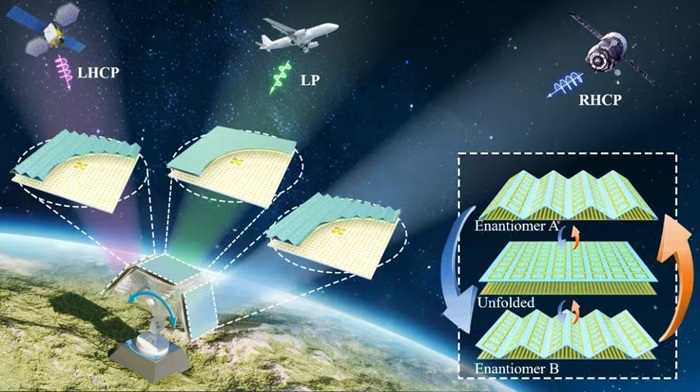 该研究以“折纸结构与超表面技术融合”为核心创新点,首次实现了对电磁波频率与极化状态的同步、动态调控,为未来可重构电磁器件的发展提供了新的路径。频率和极化是电磁波的两个基本属性,但传统器件往往难以同时灵活控制这两个参数,成为波动调控领域的核心挑战。受传统折纸艺术启发,团队设计了一种基于折纸原理的可重构超表面结构(OriPCM)。该结构可通过从二维平面到三维折叠形态的机械变形,动态改变其内部谐振器(SRR)的电磁偶极子排布,从而实现线极化与双旋圆极化之间的切换。同时,通过结构重构还可实现工作频率的调谐。
