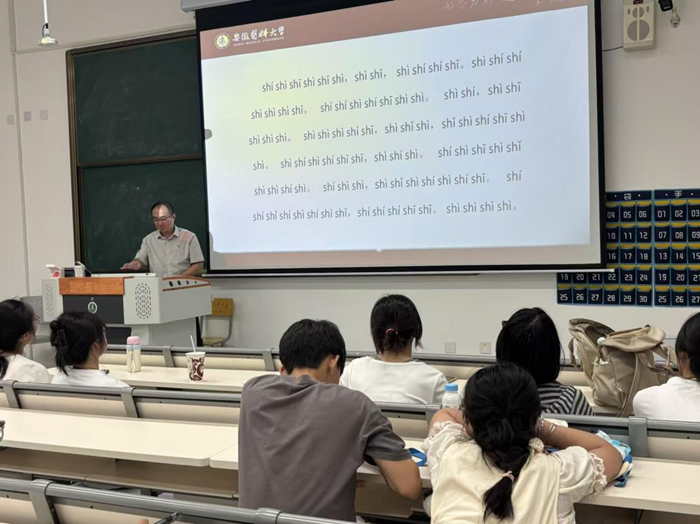 “声”情并茂,师生相约语言文化课堂9月17日下午,为增强同学们的普通话能力,性爱电影 特邀请安徽省普通话水平测试员路洋副教授为同学们开展了一场名为“普通话的习与练”专题讲座。路老师通过对比方言与普通话的差异,剖析了普通话语音、词汇、语法方面的规范标准。他辅以生动有趣的实例,指出了日常生活中常见的语音错误和用语误区。针对在场学生存在的“n-l不分”“前后鼻音混淆”“轻声儿化掌握不佳”等问题,路老师进行了耐心的纠正,并设计了多个互动练习环节。最后,路老师以绕口令的形式带领大家齐读四声歌,带领同学们感受普通话的魅力,在场气氛热烈。