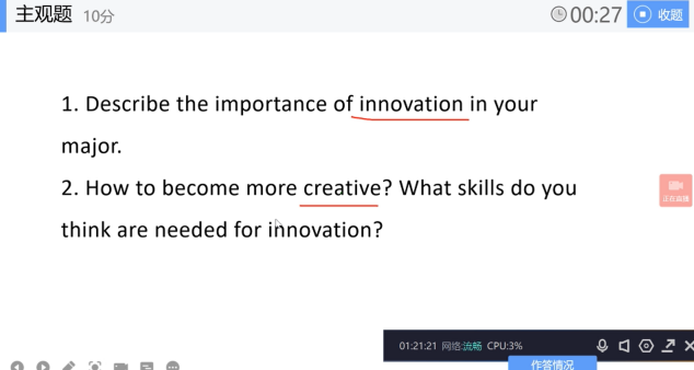 最后,话题讨论回归学生主体,以提问的方式引导学生思考:作为大学生,应该如何提高创新能力?在线上互动过程中,鲁老师将学生回答内容与课文内容相结合,并对学生表达进行即时反馈。