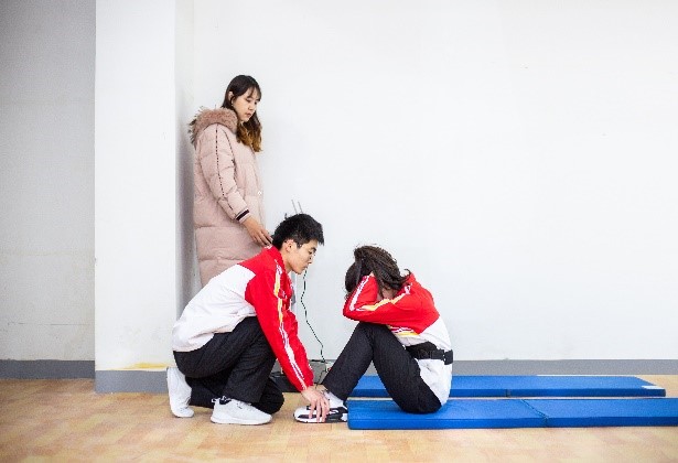 3.测试方法:受试者仰卧于垫上,两腿稍分开,屈膝呈90度角左右,两手指交叉贴于脑后。另一同伴压住其踝关节,以固定下肢。受试者坐起时两肘触及或超过双膝为完成一次。仰卧时两肩胛必须触垫。测试人员发出“开始”口令的同时开表计时,记录1分钟内完成次数。1分钟到时,受试者虽已坐起但肘关节未达到双膝者不计该次数,精确到个位(图6,图7)。