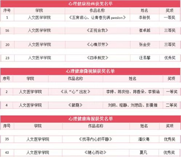 近日,由校党委学生工作部(处)、大学生心理健康教育辅导中心组织的2024年新生心理健康月“五育润心,青春向阳”心理健康作品征集活动公布结果。性爱电影 2024级运动康复专业学生成绩出色,获一等奖2项,二等奖1项,三等奖2项,优秀奖3项。